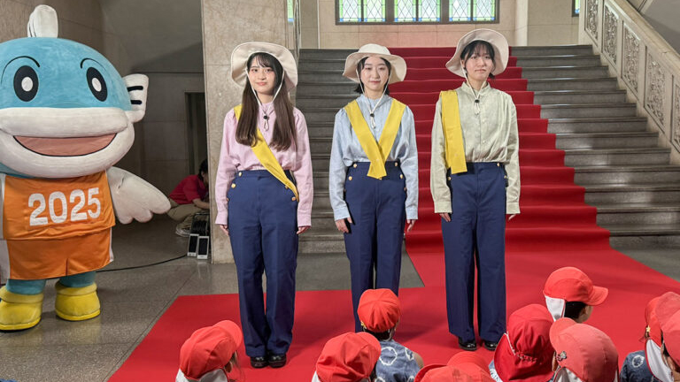 地場産品の素材で、麻のシャツは近江の麻(東近江市)、綿のパンツは高島織(高島市)、絹のサッシュは浜ちりめん(長浜市)が活用されました。湖東繊維工業協同組合では、水色、緑、ピンクの3色の近江の麻でシャツを約380着製作しました。