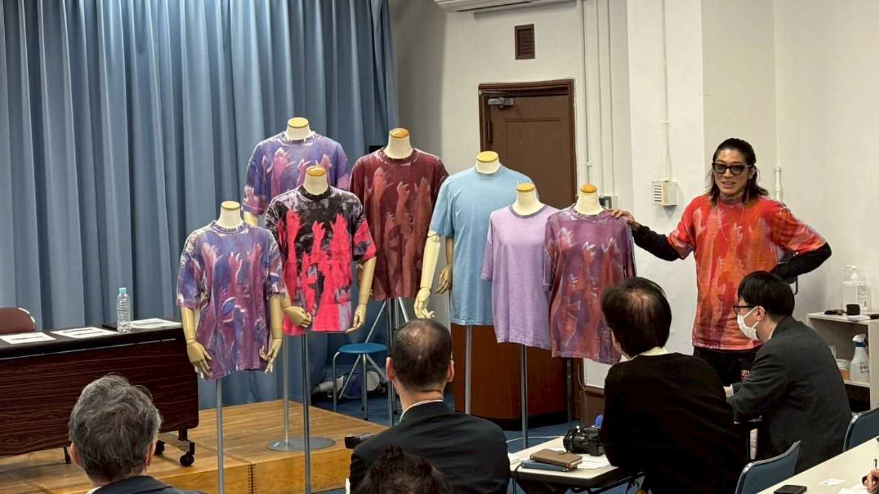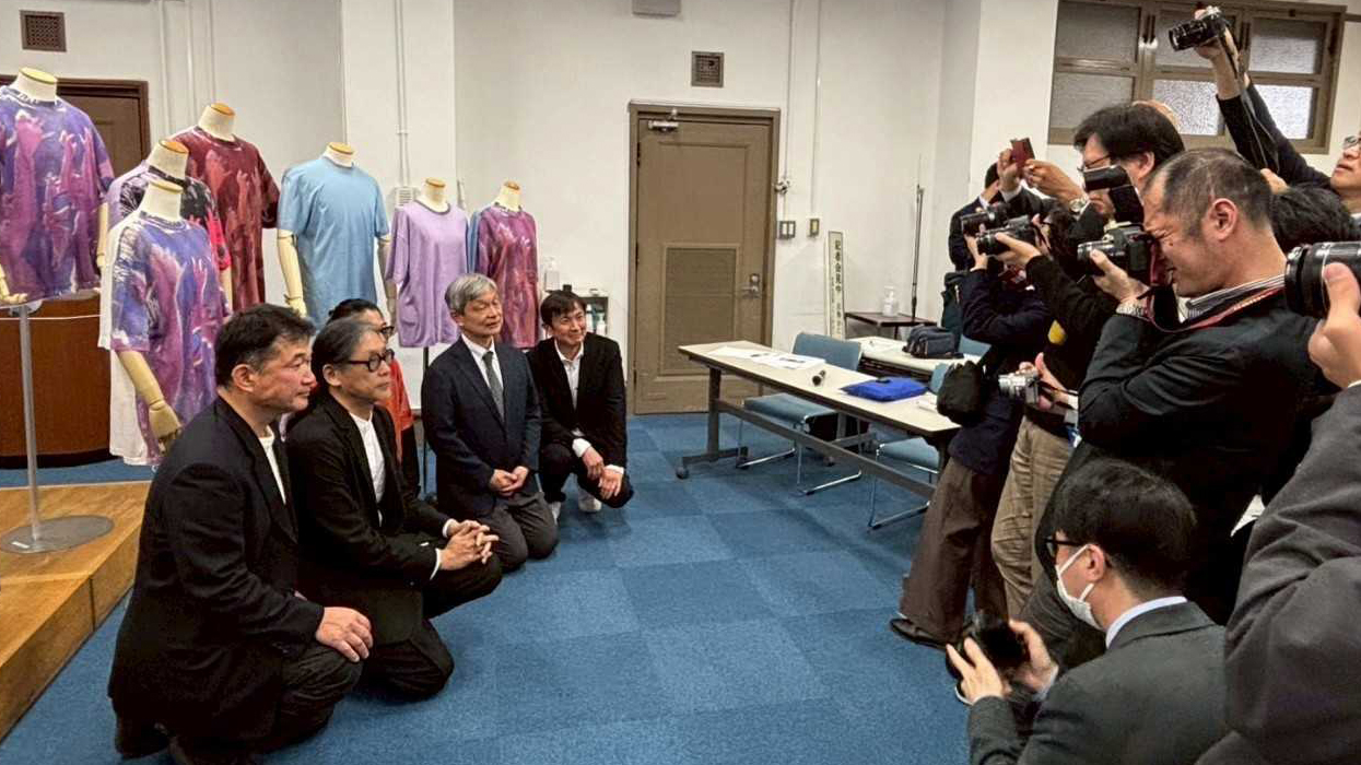 会見では、副理事長の辻英幸(担当:プロジェクトリーダー / 所属:株式会社ツジトミ)・澤宏一郎(担当:染色 / 所属:澤染工有限会社)、水谷真也(担当:クリエイティブディレクター・手捺染 / 所属:株式会社おおまえ)が、製品開発の背景にあるストーリーや、こんにゃく糊加工をはじめとする独自の技術、そして私たちの未来に向けたビジョンについて、詳しくお話しさせていただきました。