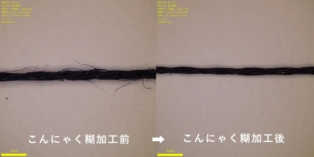 コンニャク糊をコーティングすることで、右の写真のように飛び出した先端部が少なくなり、肌触りがよい、涼しく快適な着心地になります。