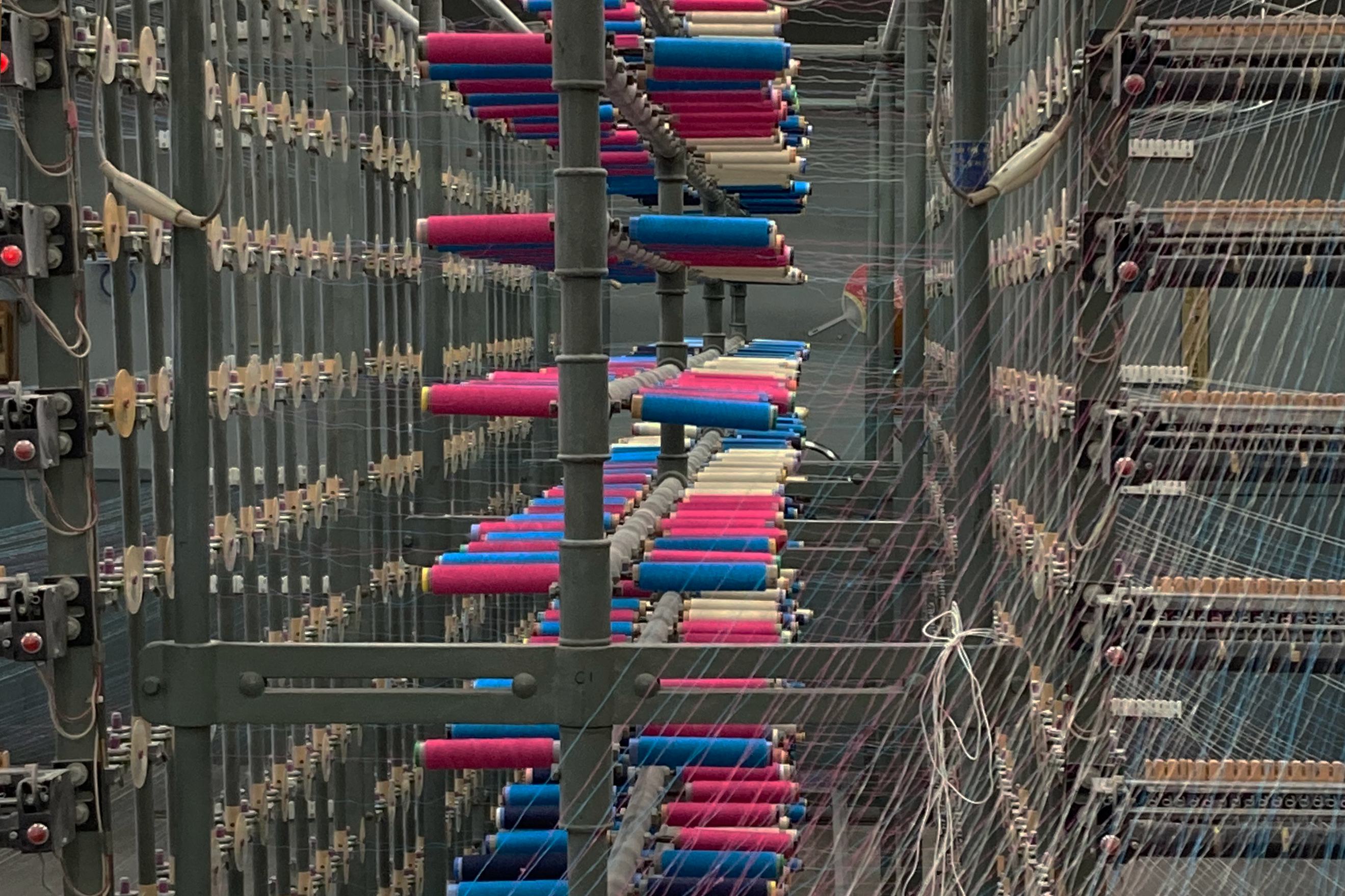 数百本から数千本にもなる経糸を、布の幅や密度に合わせて整然と巻き取ります。この時、一本一本の糸に均一な張力をかけながら、正確に長さと配列を揃えることが、織り上がりの布にムラを出さないために重要です。