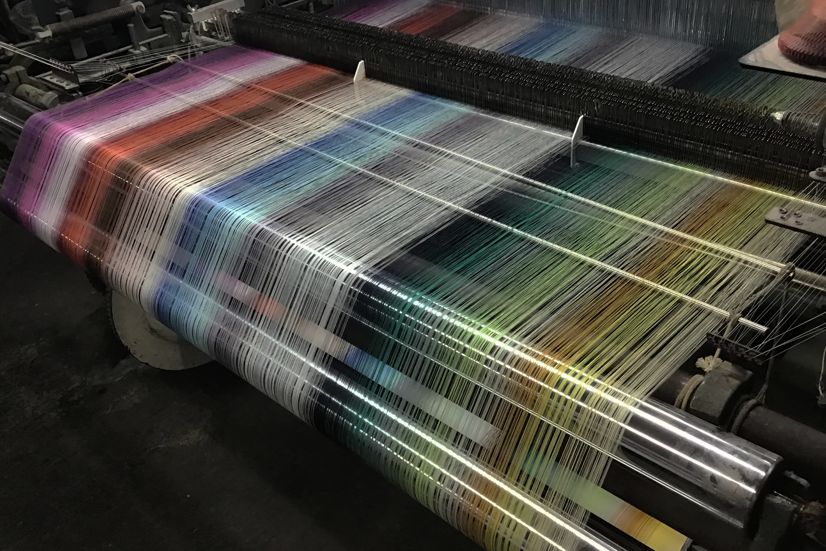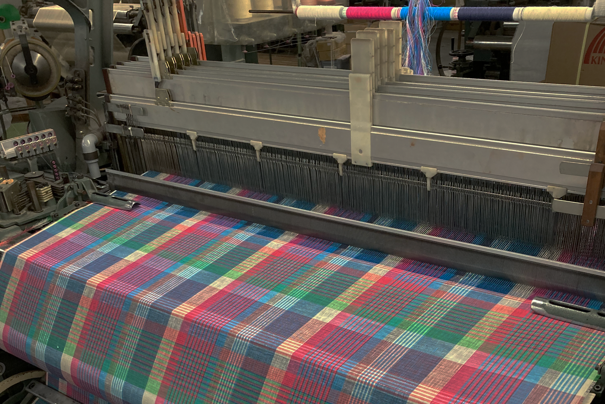経糸(たていと)と緯糸(よこいと)を交差させ、平面の布を形作るのが布織の工程です。